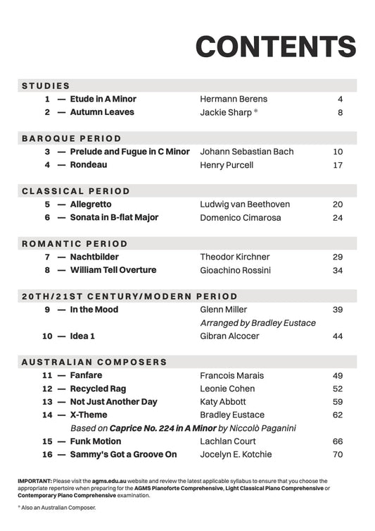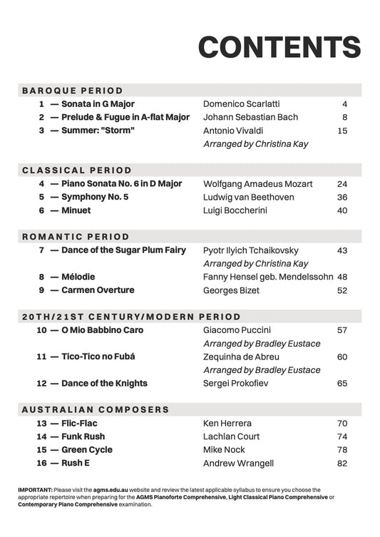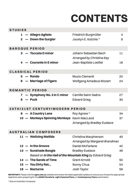 A captivating compilation of works, designed to assist in preparing the repertoire component of AGMS Piano examinations.